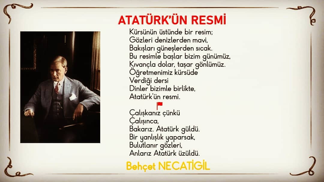 Hem çok iyi bildiğimiz hem de ilk defa okuyacağımız 10 Kasım Atatürk şiirlerini inceleyeceğiz. İlk olarak görsellere göz atalım. Hazırladığımız şiirler 10 Kasımda Atatürk’ü anlatmak için kullanılabilir. Ülkesi için yaptığı fedakârlıklar, ileri görüşlülüğü vurgulanarak genç nesillere ilham verilebilir.