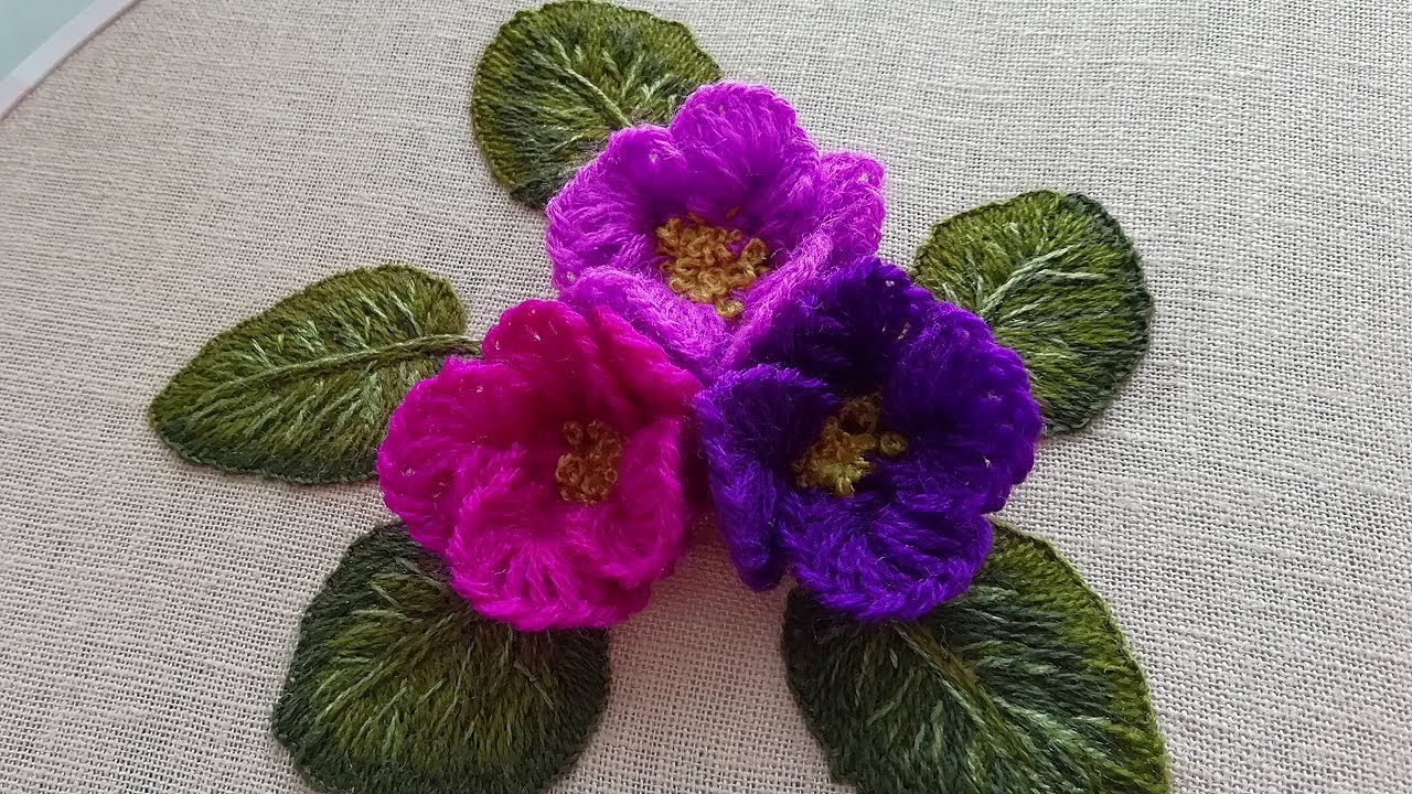 Menekşe renklerinde 3 boyutlu nakış yapılışını öğreneceğiz. Yine çiçeğin yanında el nakışı yaprak yapımını da öğreneceğiz. İkisi birlikte çok güzel takım olmuş. Farklı çiçeklerle de birleştirerek panolar, tişört süslemeleri yapabiliriz. Lavantalar, leylaklar, gelincikler, doğal pamuk dalları, akşam sefaları bir arada kullanılarak tasarım modeller oluşturabiliriz. Yeni öğreneceğimiz çiçeği tamamladığımızda aşağıdaki gibi görünecek.