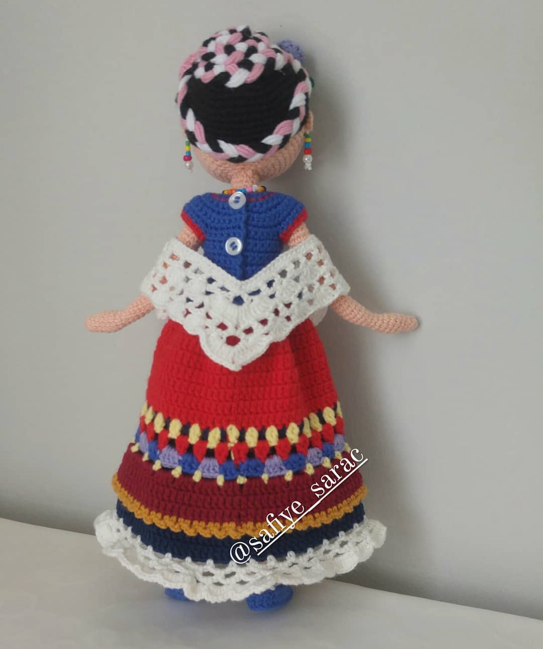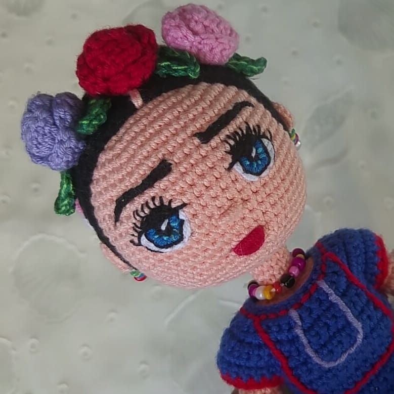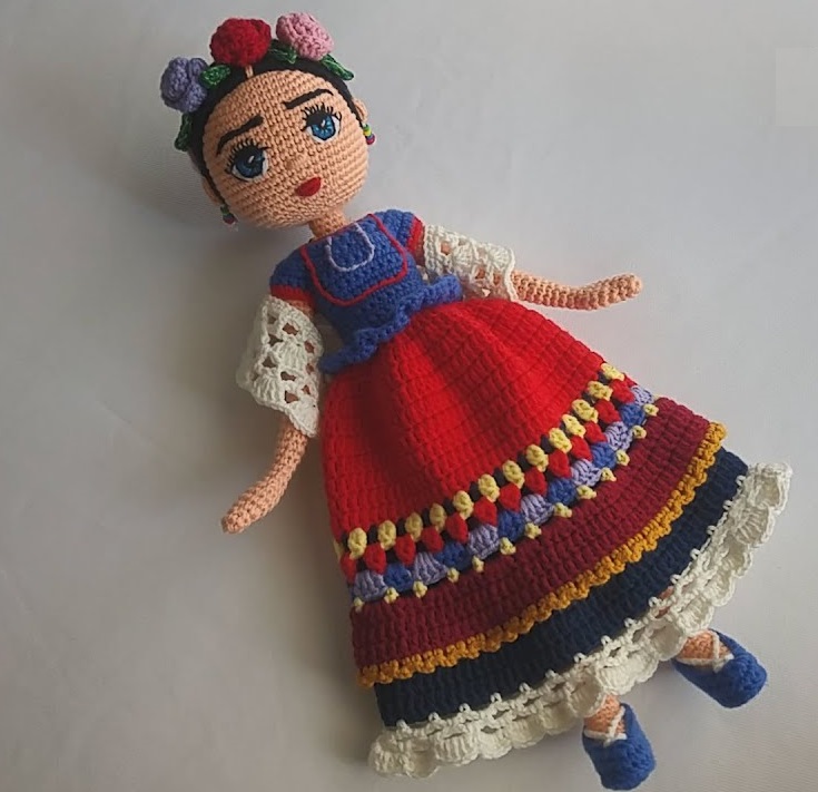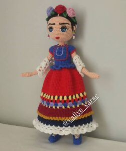 Fridayı tamamladığımızda yukarıdaki gibi görünecek. Saçlarında gülleri, renk renk elbisesi ile hemen yapılışını öğrenmeye geçelim. Amigurumi Frida Kahlo bebek yapımını izliyoruz.