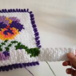 Yıldız örgü tekniği ile 6 dilimli taban örüyoruz. Lifimizin ortasından 6 fıstıkla başlayarak fıstık üzerine dilimlerin ilk sırasını oluşturuyoruz. Dilim sonlarında her sırada artırma işlemi yaparak 8 sıra örüyoruz. Tabanı tamamladıktan sonra kenar uygulaması için zincir yuvaları örüyoruz. Kenar oyası 4 sırada tamamlanmaktadır. İlk sırada büyük zincir yuvalarına 15 tane ikili trabzan yaptıktan sonra ikinci sırada yine aynı sayıda 15 tane 3 lü trabzan örüyoruz. Tek farklılık ilk sıradaki trabzanların ortasından ilmek alarak örmemiz. 3. Sırada punç ipi ile aralara 1 zincir çekerek 15 tane ikili trabzan yapıyoruz. Son sırada sadece pıtırcık yaparak kenar uygulaması tamamlanıyor. Lifin üzerindeki yeşil ip ile oluşturduğumuz zincir yuvalarını 6. sırada oluşturuyoruz. Dilim aralarında ve dilimin ortasında olacak şekilde lale çiçeklerimiz için trabzanlı zemin hazırlıyoruz. Laleleri ördükten sonra ortalarına boncukları diktikten sonra lifin üzerine dikerek sabitliyoruz. Orta parçayı da büyük tabanı başladığımız gibi başlayıp 1 sıra ördükten sonra yeşil iple yuvaları oluşturup çiçekleri yaparak tamamlıyoruz. Lifin ortasına dikerek sabitliyoruz ve modelimizi tamamlıyoruz.