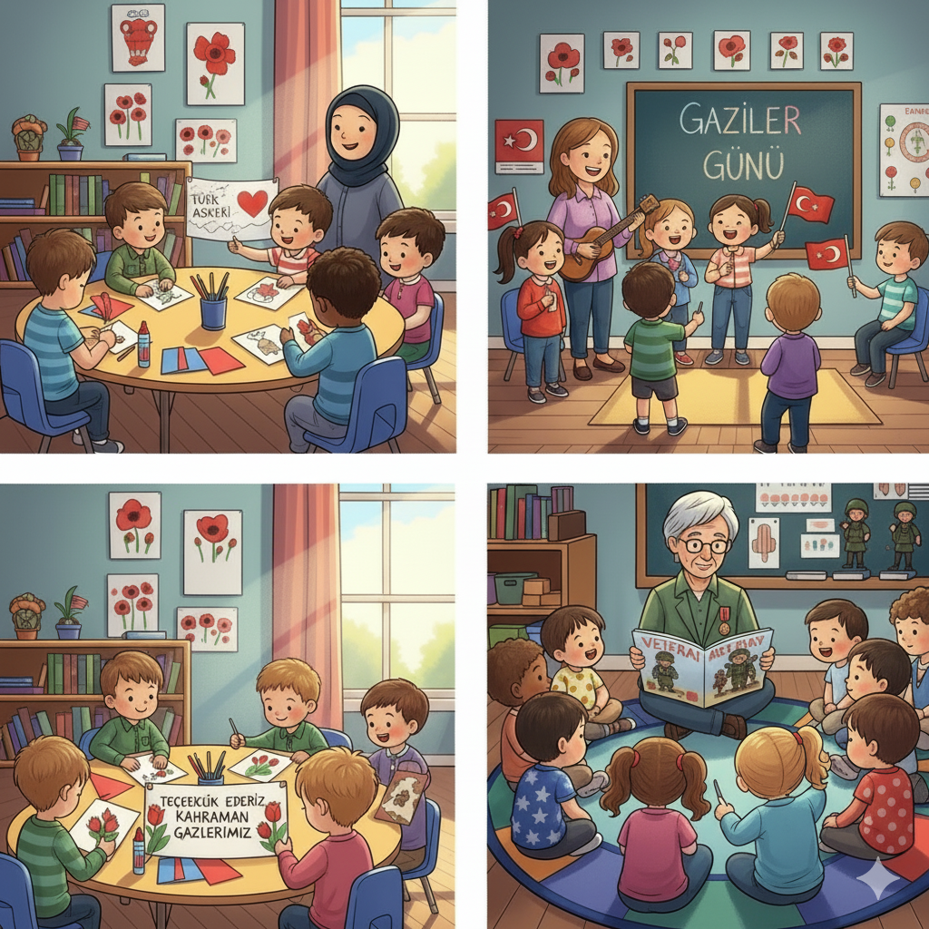 Çok sevdiğimiz vatanımız uğruna canlarını hiçe sayan kahraman gazilerimizi anmak boynumuzun borcu diyebiliriz. Her yıl 19 Eylülde Gaziler gününü kutluyoruz. Bu anlamlı günde okul öncesi çocuklarımızla ilkokul çağındaki çocuklarımızla birlikte vatan sevgisi, bayrak, gazilik gibi kavramları çok karmaşık olmayacak şekilde onların anlayacağı dilde öğretebiliriz. Öğretirken de güzel etkinliklere başvurabiliriz. Gazilerimizi anlatan şiirler, yazılar okuyabiliriz. Dramalar hazırlayabiliriz. Sanat etkinlikleri yapabiliriz. Sosyal farkındalık etkinlikleri hazırlayabiliriz. Eğer mümkünse gazi ziyaretinde bulunabiliriz.