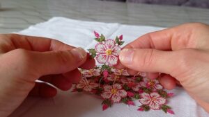 Harika bir çiçek. Dilediğiniz yerde kullanabilirsiniz. Havlularda, namaz örtülerinde, tespihlerde… Şimdi aynı modelin birkaç farklı renkle yapılmış uygulamasını görelim.