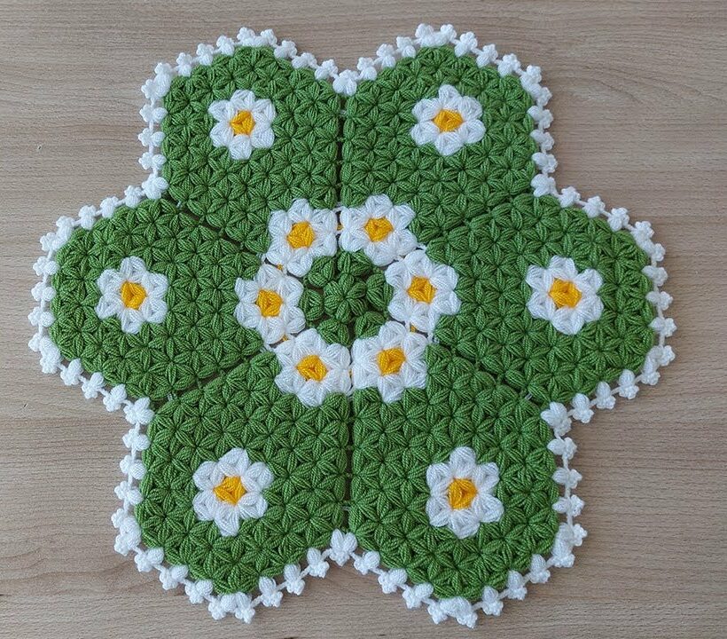 Düz yeşil zemini örerken aralara papatyaları serpiştirdiğimiz bir model hazırladık. Üçgen dilimlerle hazırlanmış, baklava dilimli motifleri andıran yuvarlak lif modellerinden. Çeyizlik papatya lif modelini aynı renklerle veya farklı renk düzenleriyle örebilirsiniz.