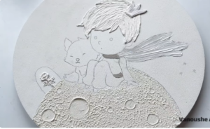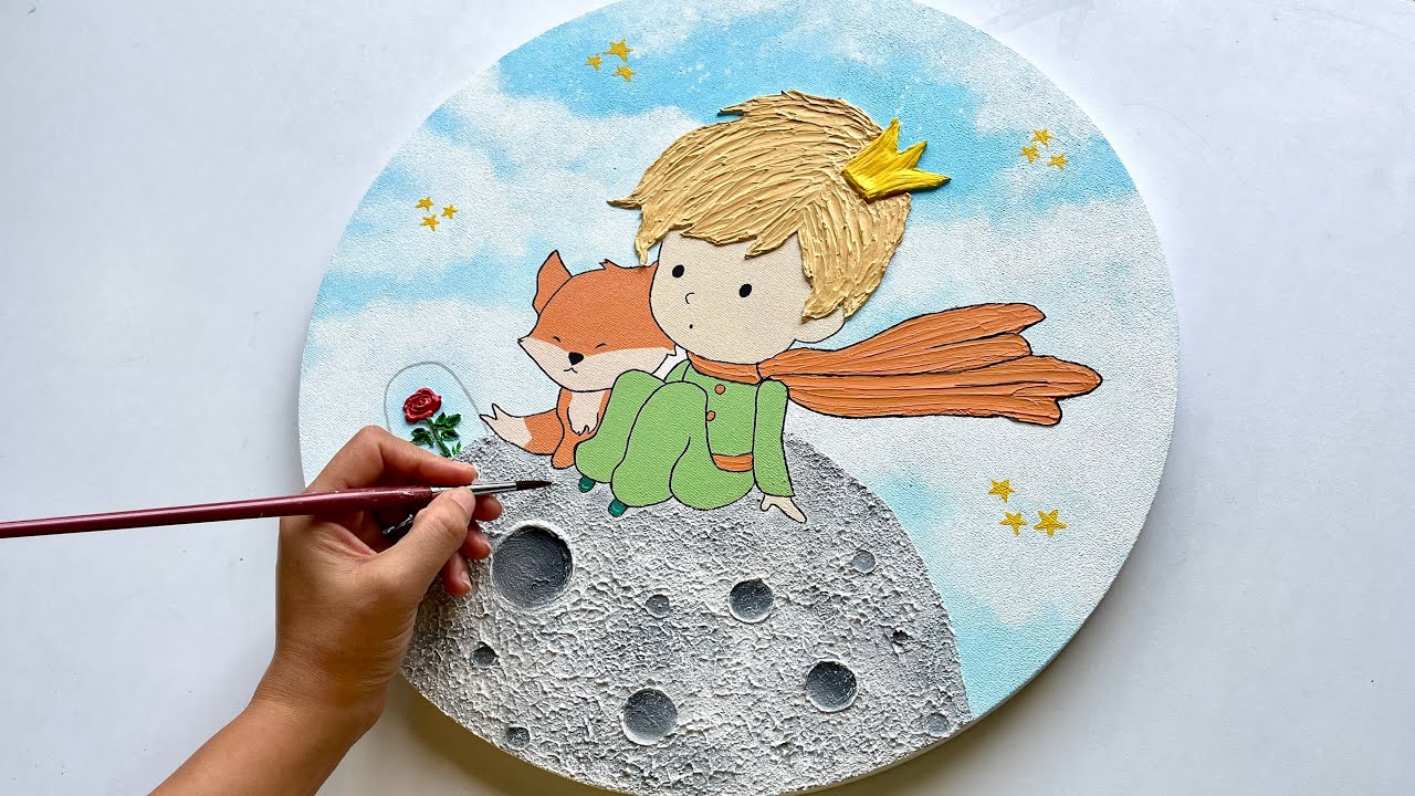 Yanında gülü, tilkisi ve ayın üzerinde duran küçük prens tablosu yapıyoruz. Hatta ışıklandırarak gece lambası modellerine çevirebiliriz. 40 cm tuvale yapılmış harika bir tablo. Dokulu kısmı yaptıktan kuruyunca boyama kısmına geçiyoruz. Akrilik boyalarla tablomuzu boyuyoruz.