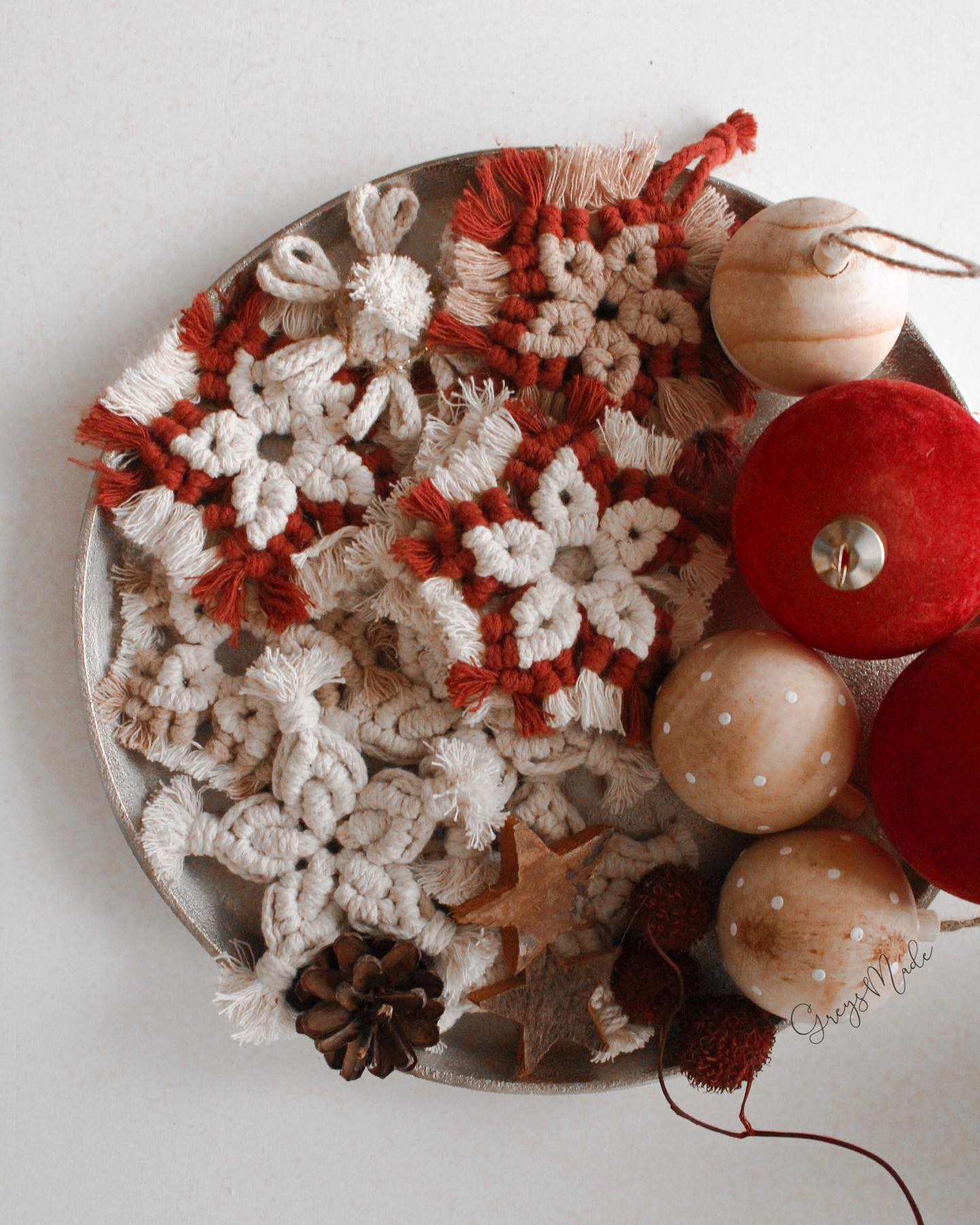 Pamuklu makrome iplerinden ahşap halka kullanmadan kar tanesi yapımını öğreneceğiz. Tek renkli veya iki renkli olarak çalışılabilir. Kar tanelerini anahtarlık, duvar süsü, charm veya yeni yıl süsleri olarak kullanabiliriz. Yeni yıl ağaç süsleri olarak kullanabiliriz.