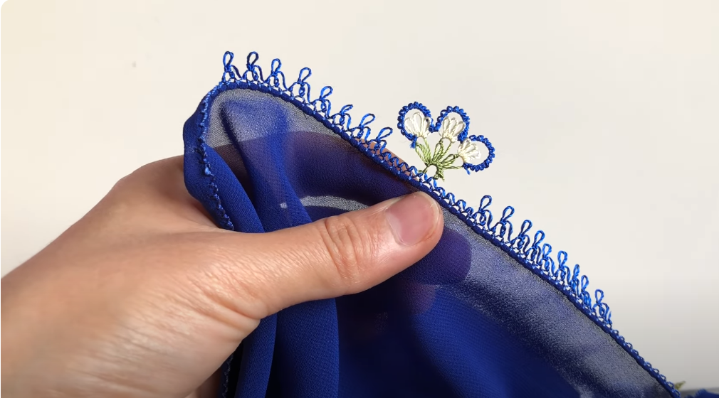 Mavi çiçekli iğne oyası yazma örneği tamamlandığında yukarıdaki gibi duracak. O halde anlatıma geçip yapılışını öğrenelim.