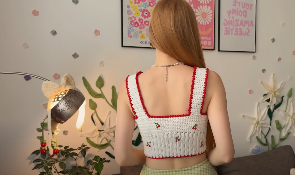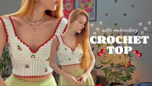 Beyaz renkli pamuklu iplerle büstiyer örüyoruz. Daha sonra kenar bordürü için kırmızı ip tercih ediyoruz. Büstiyerin üzerini ise basit nakış modelleri ile süsleyerek kiraz deseni oluşturuyoruz. Limon dilimleri, karpuz dilimleri, çilek desenleri ile örgülerimizi süsleyebiliriz. Yaz meyve desenlerini örgülerimize uygulayabiliriz.