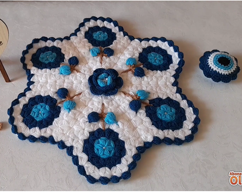 Yıldız tekniği ile örülmüş harika bir lif daha. Sade ve kullanışlı. Nazar çiçeği lif yapılışı için 3 renk kullanıyoruz. Beyaz, açık mavi, koyu mavi renkler kullanıyoruz. Life boncuk eklemesi de yapabiliriz.