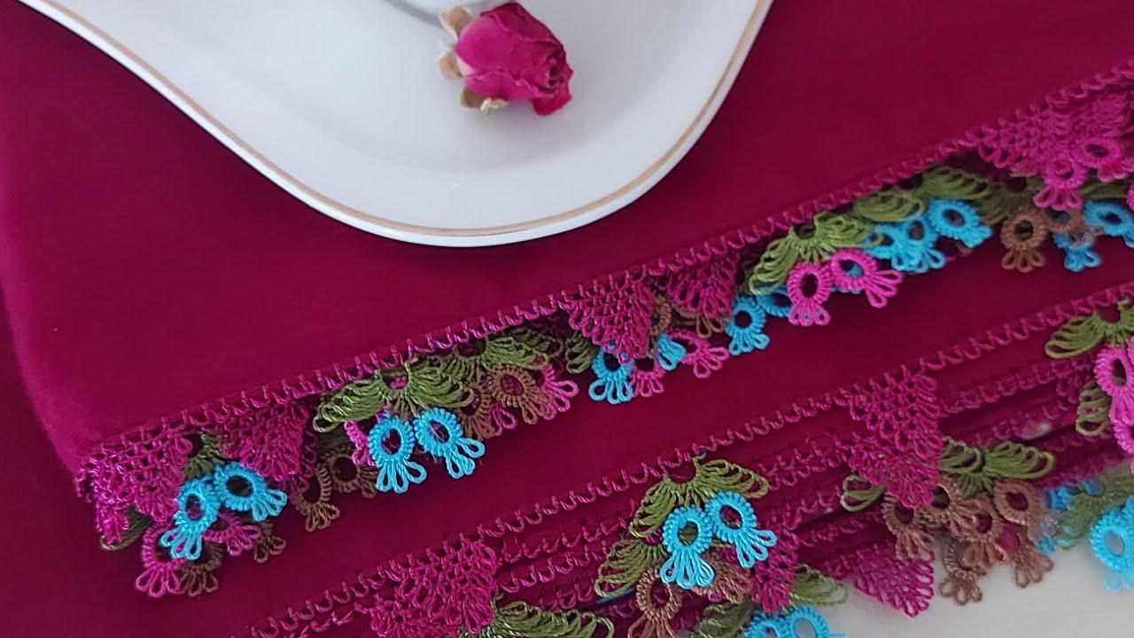 Pipet kullanarak iğne oyası sinek kanadı kullanılarak yapılmış harika bir örnek. Tek renk yazmalarda, desenli yazmalarda keyifle yapacağımız kolay örneklerden. Düğümlü motifli kısımları yazma içinde bulunan renklerden seçebiliriz.