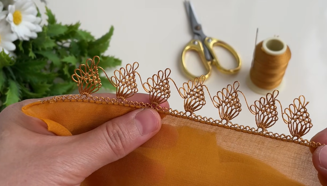 İğne oyalarından modası hiç geçmeyecek harika bir örnek daha. Hardal sarısı yazmaya iğne oyasını yeşillere, beyazlara, siyahlara, kırmızılara yapabiliriz. Hepsine çok yakışacaktır. Tek renk ve sıralı şekilde yapıyoruz.