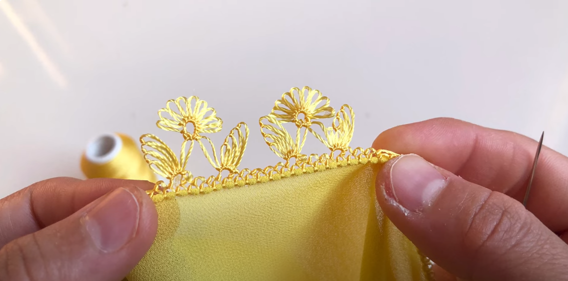 Sarı tonlarında yazmaya uyarlanmış yeni bir modelin yapılışını izleyeceğiz. Daha sonra ister siyah ister beyaz, kırmızı istersek renkli desenli yazmalara en güzel oyaları yapmaya başlayacağız. Yazmanız eğer siyah veya beyazsa her renkle oyayı yapabilirsiniz. Her renk çok yakışacaktır. Diğer renklerde yazmalara ise seçtiğiniz renge uygun ipleri kullanabilirsiniz.