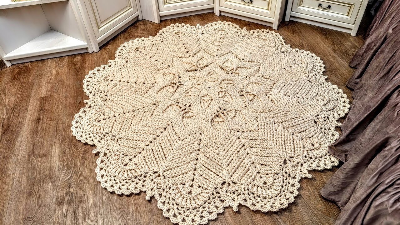 Halının çapı 1,60 cm. 6 mm tığla ve pudra renk (sanki biraz bej gibi duruyor) iple örülmüş. Bildiğimiz temel tığ işi tekniklerle örülüyor. Hangi renkle örülürse örülsün muhteşem duracak bir model. Adım adım 4 videoda tüm talimatları bulacağız. Farklı kalınlıkta iplerle de örülebilir. Bu kez paspasın ölçüleri değişecektir.
