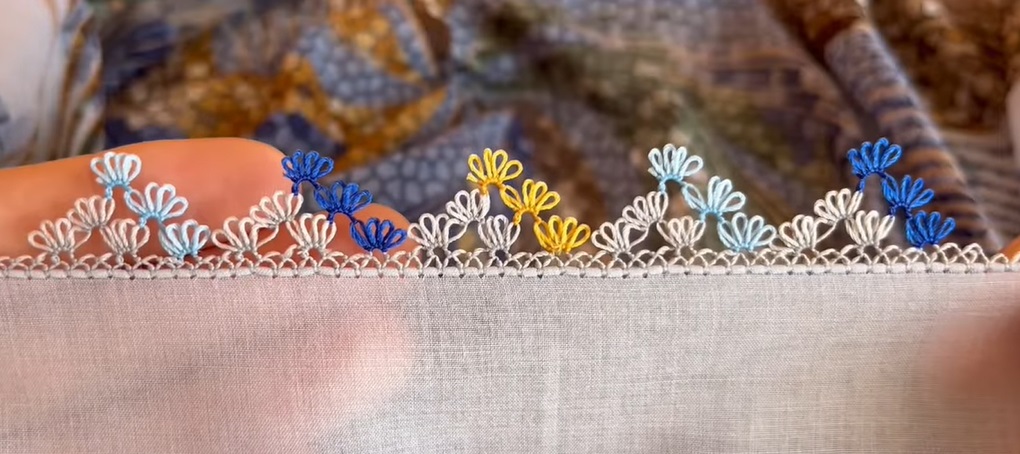 Yine harika yapılmaya değer çıtı pıtı bir oya. Tek renk, iki renk veya daha çok renk kullanılarak her renk yazmaya yapılabilir. Siyah yazmaya iğne oyası, beyaz yazmaya iğne oyası olarak çok şık duracak. Aynı zamanda kırmızılara, yeşillere, morlara, sarılara da yapabiliriz. İçinde çiçek desenleri olan yazmalara da yapabiliriz. Oya bittiğinde aşağıdaki gibi görünecek.