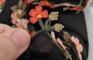 Uzun yapraklı çiçeği, pırpırlı yapraklarıyla zarif bir çiçeğin yapılışını hazırladık. Yine çiçeği fular ucu modellerinde süsleme olarak kullanabiliriz. Elbiseler, pareolar dikip kumaşların kenarlarını iğne oyalarıyla süsleyebiliriz. Yeni iğne oyası örneği tülbent modeli çiçek dalını ve yaprak dalını kısaltabiliriz. Boyunu ayarlayabiliriz.