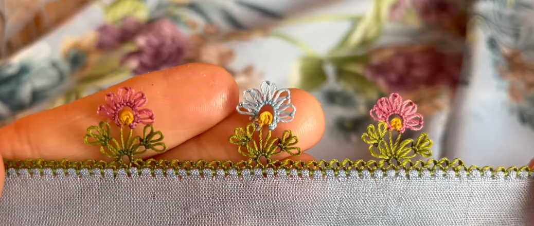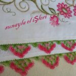 Yazma kenarlarına uyarlayacağımız bir modelin yapılışını daha hazırladık. Pembe renk iğne oyası modellerinden de diyebiliriz. Sadece pembe yazmalara değil düz her renk yazmaya ve desenli yazmalara uyarlayabiliriz. Hatta bu modeli iğne oyası dağlarla birlikte havlu kenarları modelleri olarak da yapabiliriz. İki dağ arasına çiçekli modeli kurduğumuzda iğne oyası havlu kenarları içinde uygun olur.