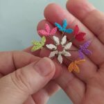Mor, siyah, kırmızı, beyaz, yeşil gibi birçok renkte yazmaya uyarlayacağımız keyifli örneklerden. İğne oyası düğüm teknikleriyle yapılmış papatyalar yazmalara çok yakışacak.