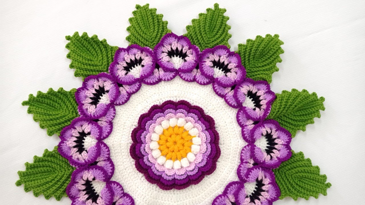 Mor, lila, beyaz ve yeşil renklerle örülmüş çok güzel bir örnek. Orta göbeğe, tohum kısmına sarı renkle başlıyoruz. Dış çerçevelerinde yapraklarla da yapraksız da çok güzel duruyor. Yaprak çeşitli dantel örneklerinde kullanılıyor. Kanser yaprak modeli olarak geçiyor. Sık iğnelerle yapılıyor.